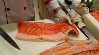 cara fillet ikan salmon yang cepat dan bersih, dilakukan orang orang yg berpengalaman. dengan pisau yang tajam membuat irisan daging ikan yang lembut.